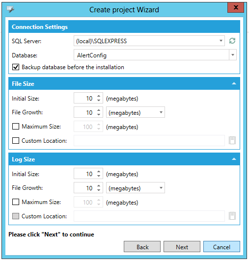 File Growth - Set the intended project log file growth by entering a number in the text entry field (or use the up/down arrows), then use the nearby pulldown menu to select from megabytes or percentage (%).