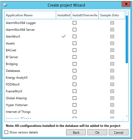 In this screen, you can select the components (providers) that you wish to include in your new project by clicking on the Install/Overwrite checkbox to the right of each item's name. Once any item is selected (checked), you'll then have the option to include Sample Data - similar to the options provided during initial installation of your ICONICS product. A check mark will appear to the right of any item that has already been Installed. In those instances, you can still opt to overwrite the existing item (as well as include Sample Data).