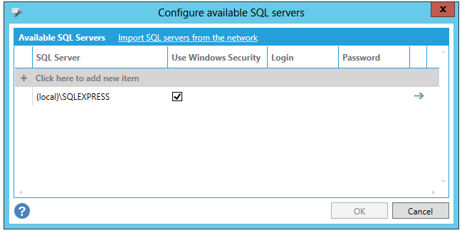The Available SQL Servers may already be listed within the window. You can click on the Import SQL servers from the network link to refresh the window and add any other SQL Server installations.