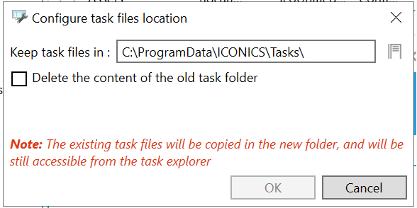 Clicking the Task Folder Configuration button opens the Configure task files location window, shown below, which will allow you to set the location of the task files as well as optionally delete content of an older task folder. Note that the existing task files will be copied in the new folder, and will still be accessible from the task explorer.