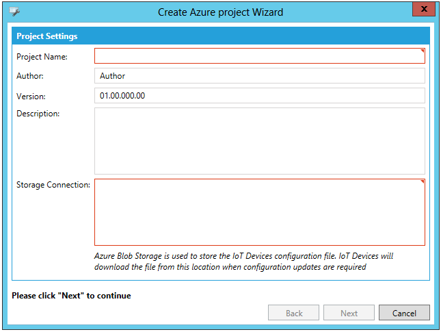 Selecting IoT Project Wizard opens the Create Azure project Wizard window, shown below.