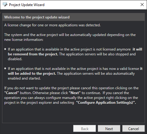 Clicking the Update Applications button in the Project Tools section of the Project ribbon in the Workbench opens the Project Update Wizard, which guides the user through the process of updating the project to match the license.
