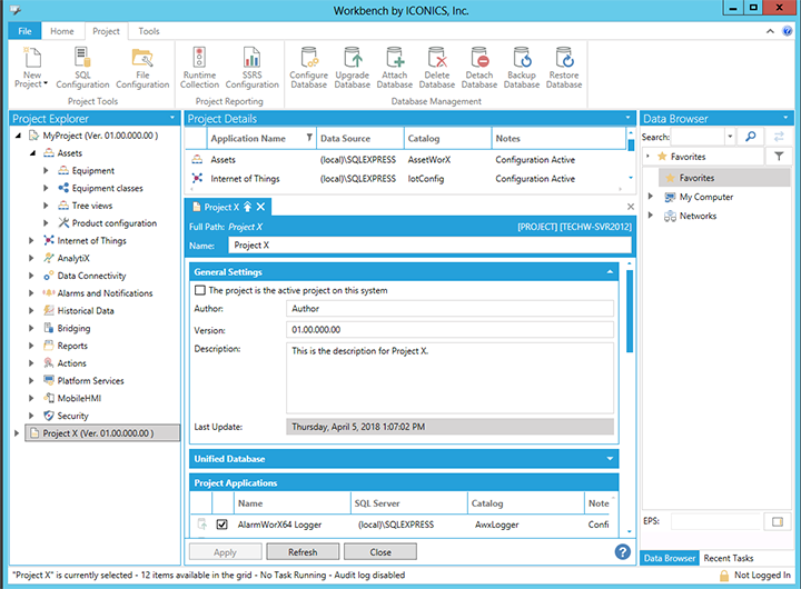 If the Project Update Wizard needs to add an application, it will prompt the user for SQL Server credentials used for the configuration database. The user will have the option to overwrite existing configuration data or keep the configuration already present. The providers will be added to the Workbench tree and any associated services or in-process point managers will be enabled.
