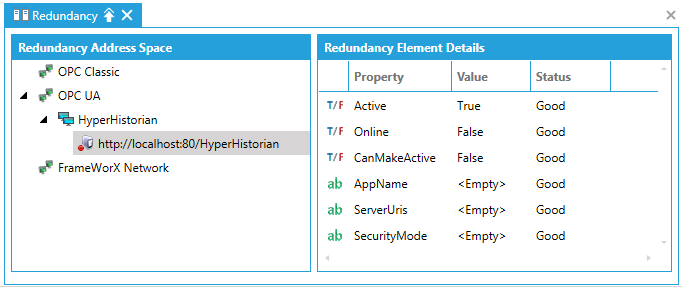 The Redundancy viewer will appear beneath the Project Details section of the Workbench. Here you can observe states of redundant ICONICS Servers and all OPC DA servers (including third-party servers).