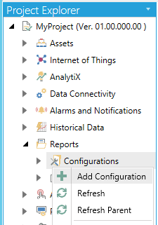 Open the Workbench and expand the Reports node and then the Configurations node. Right-click on the Configurations node or on a contained report folder, then click on Add Configuration, as shown below.