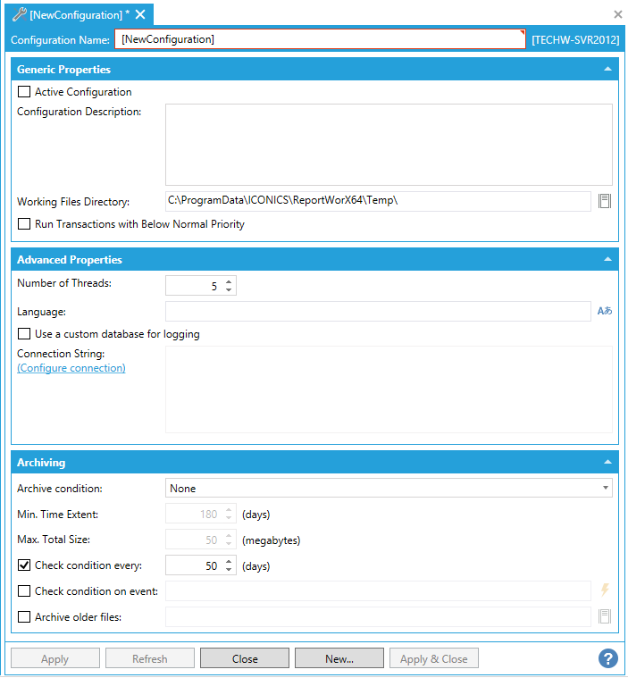 Use a custom database for logging - Click this checkbox to use a separate database for report logging. Checking this box will activate the Connection String properties.