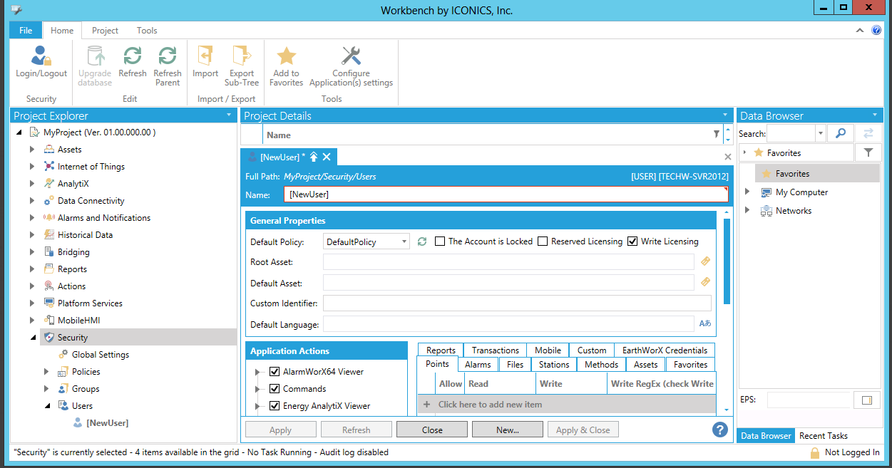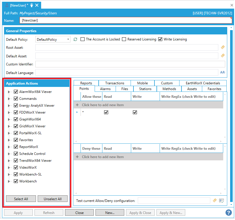 Application Actions Highlighted in New User Settings in the Security Provider in the Workbench