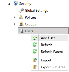 Select the Users node then click on the Add User button, shown below, in the Edit section of the Home ribbon in the Workbench.
