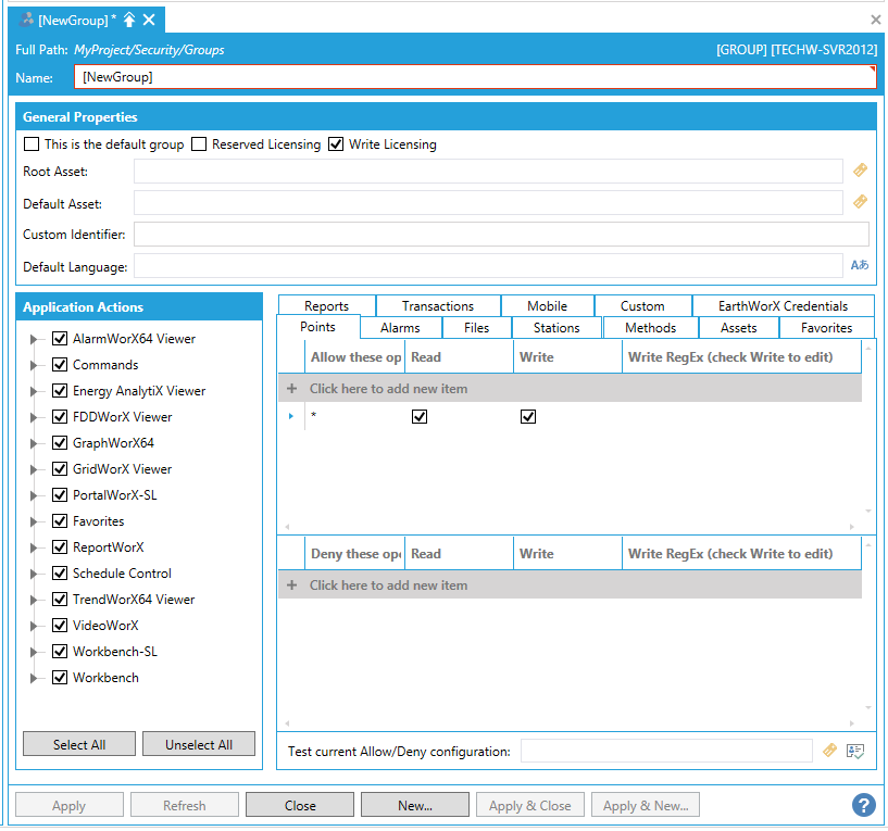 You can then use any or all of the remaining tabs to complete the security definitions for the group: tabs are Points, Alarms, Files, Stations, Methods, Assets, Favorites, KPIWorX Favorites, Reports, Transactions, Mobile, Custom and EarthWorX Credentials. These tabs are described in detail in Security Privileges for Users and Groups. Keep in mind that all users who become members of this group will share these privileges.