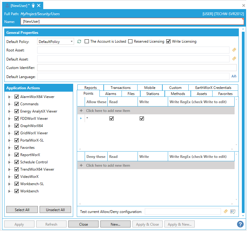 Use any or all of the remaining tabs to complete the user account definitions: tabs are Points, Alarms, Files, Stations, Methods, Assets, Favorites, KPIWorX Favorites, Reports, Transactions, Mobile, Custom and EarthWorX Credentials. These tabs are described in details in Security Privileges for Users and Groups. Keep in mind any groups you will be adding the user to; you don't have to define security privileges for the user if those same privileges are defined for a group that the user will belong to.