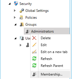 Select your group (in this example, "Administrators") then click on the Membership button, shown below, in the Edit section of the Home ribbon in the Workbench.