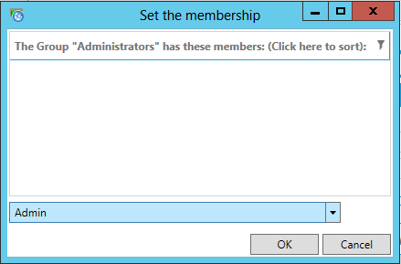 This opens the Set the membership window, as shown below. Use the pulldown menu to select a user (in this example, "Admin"). Once selected, click OK.