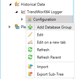 1. Right-click the Configuration node to which you wish to add a Database Group in the TrendWorX64 Logger navigation tree and click on Add Database Group, as shown below.