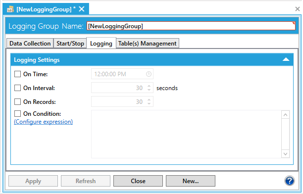 The Logging tab in the Logging Group dialog box determines the settings and conditions for storing historical information into the database for the selected logging group. It provides the means necessary to control the logging operation only. If you wish to set the conditions for data collection you should set those properties on the Start/Stop tab.