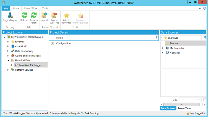 From the Workbench, expand your Project in the Tree Explorer, then expand the Historical Data node. You'll see the TrendWorX64 Logger node of the Tree Explorer.