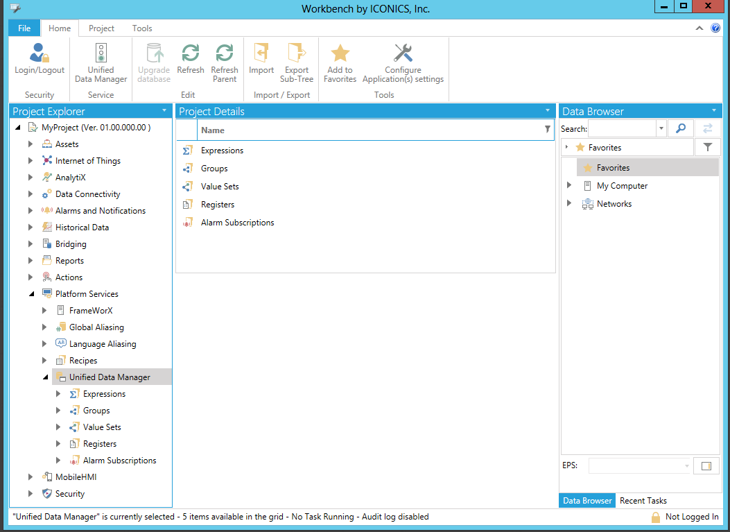 The Unified Data Manager (UDM) is a framework application that supports data management for a number of different and disparate ICONICS GENESIS64 applications. Just like the Microsoft Management Console or MMC supports snap-ins that expose different Windows settings and Windows application and service settings, the Unified Data Manager's is a front end to data stored in a SQL database containing values, data, and stored functions required for use elsewhere in the GENESIS64 application suite. Some items are exposed as OPC objects and can be accessed from ICONICS applications via the Unified Data Browser. By using the Unified Data Manager, you can reduce development time and eliminate redundant work by storing items in a database for common use. For more information, refer to the Working in the Unified Data Manager topic.