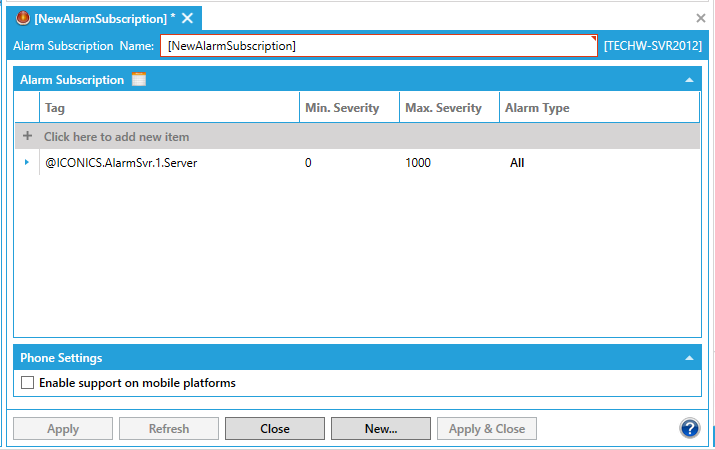 In the Phone Settings section, clicking the Enable support on mobile platforms allows you to use the alarm subscription properties set here with mobile devices.