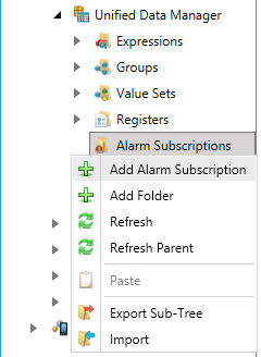 Right-click the Alarm Subscriptions node in the navigation tree and select Add Alarm Subscription, as shown in the figure below.