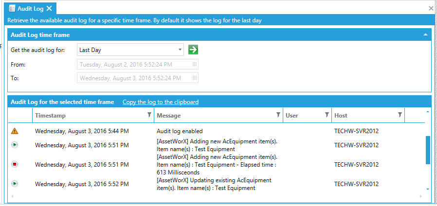 This section allows users to retrieve the available audit log for a specific time frame. By default, it shows the log for the last day.