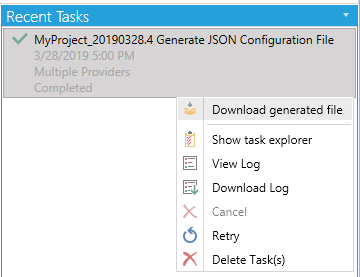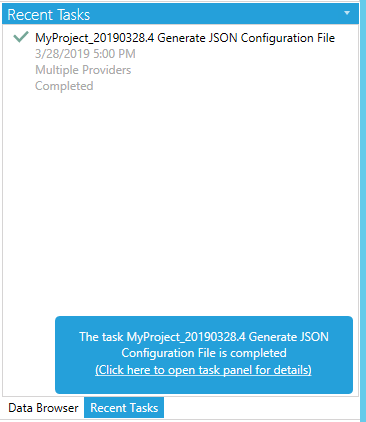 Generate JSON Configuration File Task in the Recent Tasks Section of the Workbench