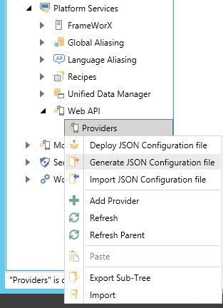 Right-click on the Providers node, then click on Generate JSON Configuration file, as shown below.