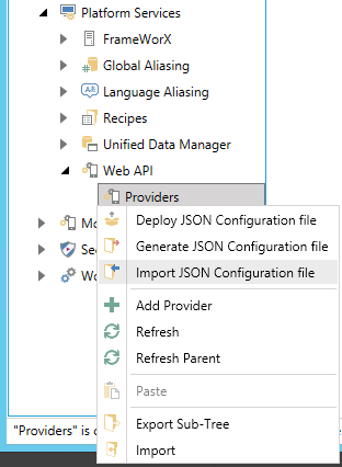 Right-click on the Providers node, then click on Import JSON Configuration file, as shown below.