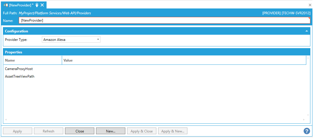Provider Type - Use the pulldown menu to select from Amazon Alexa, Microsoft Bot, or Google. Notice that changing the Provider Type will load its own corresponding set of Properties in the bottom section of the window.