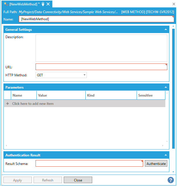 4. A new form will populate. Fill out this form with the required settings to invoke the JWT authentication method exposed by the server you wish to interact with, and click Authenticate. If the authentication is successful and a JWT could be retrieved, the result will be shown in the Result Schema textbox. This Web Authentication Method will be used later.