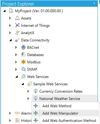 The sub-branches beneath a newly created Web Service (as mentioned in Create a New Web Service) allow you to create a Web Manipulator.