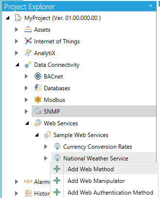 The sub-branches beneath a newly created Web Service (as mentioned in Create a New Web Service) allow you to create a Web Method, which allows you to select from different data sets that can be selected from later within an integrated ICONICS application (GraphWorX64, etc.).
