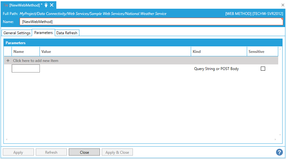 Once you have completed making edits to the Web Method Instance, click Apply to save your settings and Close to exit.