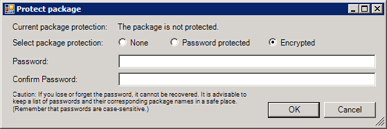 of the ribbon's Project tab. In the window that opens, navigate to and select the package, and click Open, which opens the Protect Package dialog shown below. To password protect the project, select the Password Protected option; to encrypt and password protect your project, select the Encrypted option. Then enter the password that will unlock the password protected or encrypted file when it is unpacked.