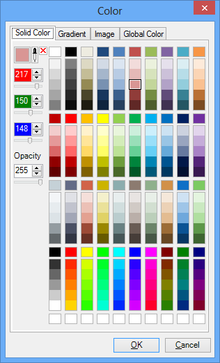 1. Click the square with a color in it to open the Color selector. Here, you can choose a common color or enter numbers into the textboxes on the left-hand side of the selector to create a custom color and opacity. You can also use a gradient, image, or global color (set with a global alias) as the color for the line connecting the sample data points on the plot.