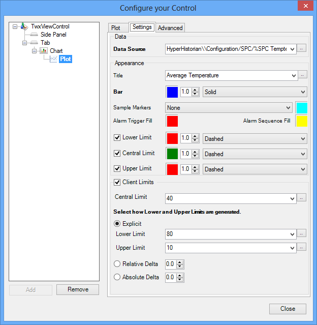 12. Below the Central Limit textbox, enable one of the following radio buttons to select a method for showing the lower control limit (LCL) and upper control limit (UCL): Explicit, Relative Delta, or Absolute Delta.