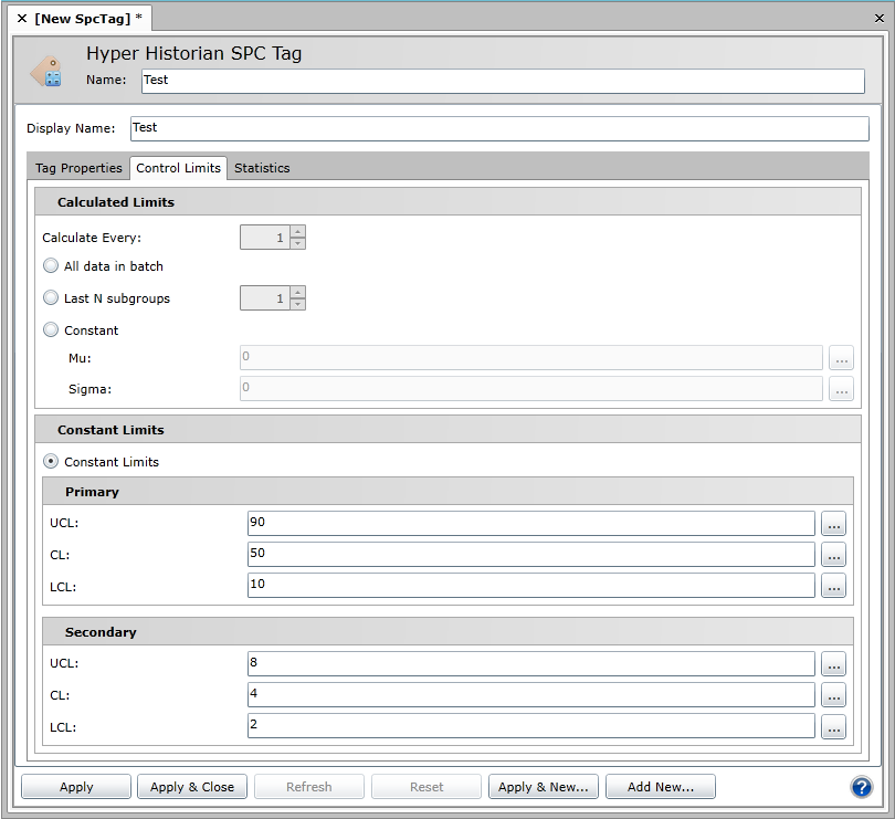 Move to the "Control Limits" tab of the dialog. In the Constant Limits area of the tab, set the Primary values to 90 for UCL, 50 for CL, and 10 for LCL. Set the Secondary values to 8 for UCL, 4 for CL, and 2 for LCL. The following image shows the completed configuration on this tab.
