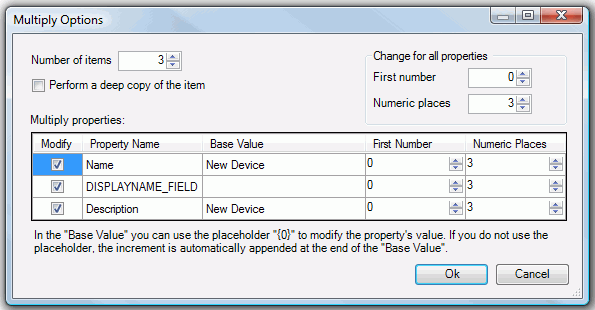 Number of items – Specifies how many times the entry (device, port, object, property, etc.) gets multiplied.
