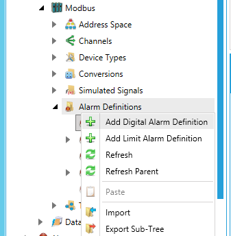 From the Project Explorer, click on Alarm Definitions, then Add Digital Alarm Definition, as shown below.