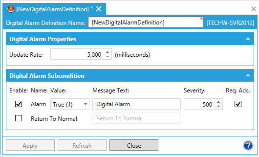 In the Digital Alarm Definition Properties dialog box, shown above, configure the following settings: