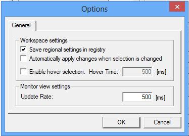 Update Rate: This specifies the update frequency (in milliseconds) of the items in the Monitor View. The monitor scans the server and displays the tag values at the bottom of the Configurator screen.