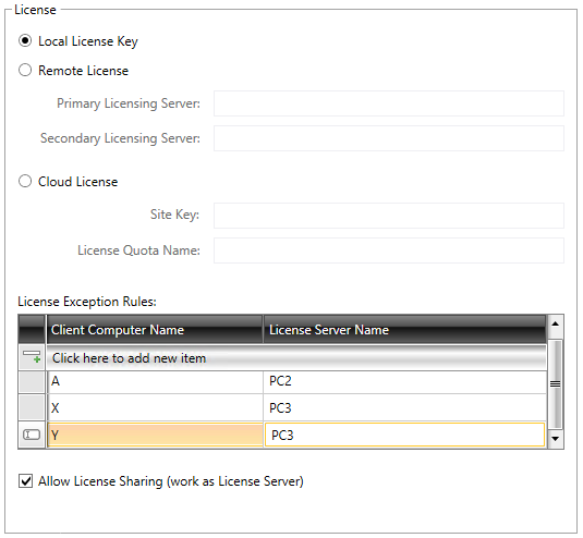 The License Exception Rules section allows users to redirect licensing to another server for specified client computers. In the example shown below, all clients connected to this FrameWorX Server get a local license. Client A gets license from PC2. Clients X and Y get their license from PC3.