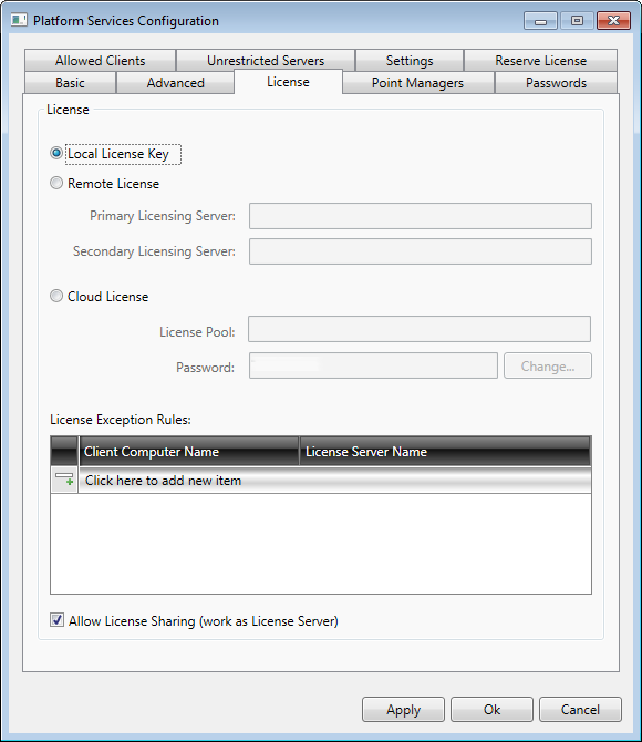 1. On the License tab, specify the server's licensing by choosing either Local License key (for the server to use its local license), Remote License (for the server to get a license from another FrameWorX Server) or Cloud License (for the server to use a cloud-based license).