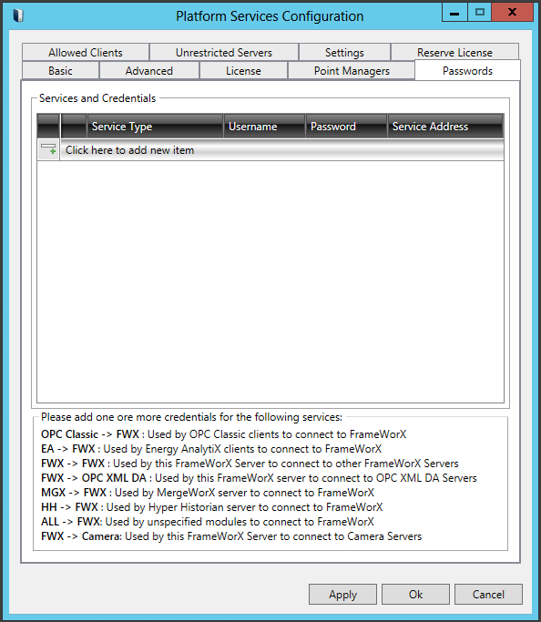 1. The Passwords tab allows users to specify credentials for different modules to connect to various servers. Currently, FrameWorX Servers and OPC XML DA servers are supported. Use * for the credentials to be used for all target addresses. These credentials are used for the modules running on the local computer.