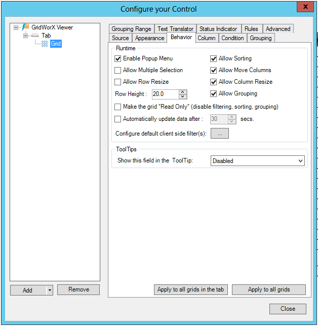 Apply to all grids in the tab - Copies the selections on the Behavior tab to the Behavior tabs for all other grids in the tab.