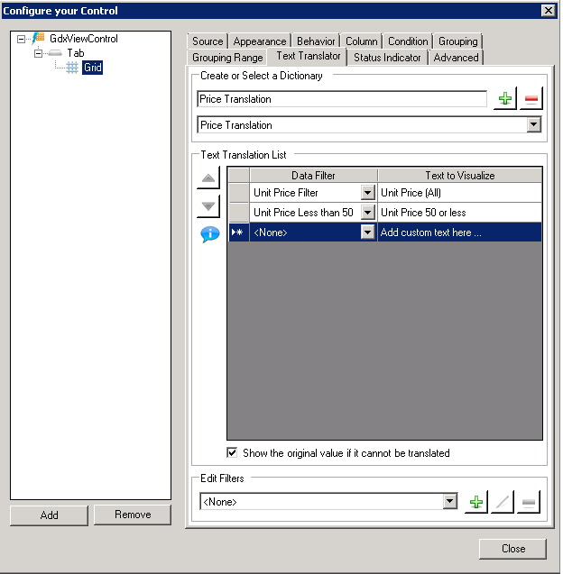 To make GridWorX values more meaningful, you can translate them into words using the GridWorX configurator's Text Translator tab, shown below. A set of translated values is called a dictionary. You can use translation dictionaries so that translated text appears in grid columns.