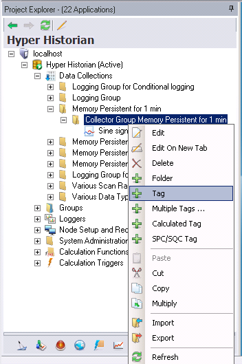 You can now create a Hyper Historian Tag on the same level of the Collector Group or within a newly created Hyper Historian Folder. Right-click on either a collector group or hyper historian folder and select Tag to proceed.