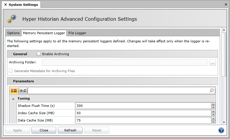 The archive settings in the General section of the tab tell Hyper Historian whether or not it should automatically detach older data from the system and where this removed data should be stored (in a folder location). For more information, refer to the Archive Settings topic.