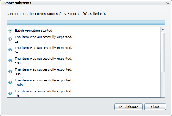 Click OK. The Export Items (or Export Subitems) dialog appears. This dialog tells you the export's progress and displays a message when the export is complete. After clicking the Close button, a message appears indicating the location where the file was saved and the file name itself. You can click the file path to open the file and make sure that it contains the information you wished to export.