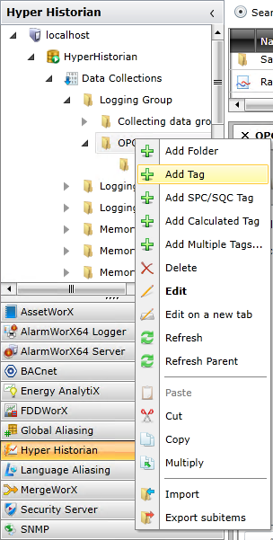 - Within the Data Collections tree node, by right-clicking the same OPC UA collecting collector group, you can add tags to the group or add a folder to organize your tags.