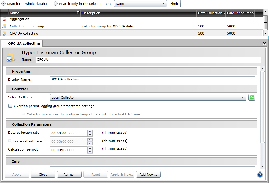 - In the list view near the top-center part of your screen, select the row containing the OPC UA collecting collector group to open it. Here, you can select the collector to which the collector group belongs as well as the data collection rate (which is the sampling rate) and the calculation period used for tag aggregates that you add to the group’s tags. Again, you can leave the settings here alone. However, if there is a different rate at which you would like to collect data samples, feel free to change it in the Collection Parameters section.