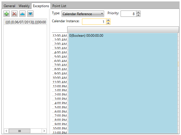 Exceptions Tab in the Schedule Control (from a BACnet Schedule View configuration) in GraphWorX64 Display Runtime with Calendar Reference Type